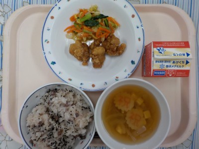 お赤飯、鶏のから揚げ、野菜のポン酢和え、祝い椀、牛乳