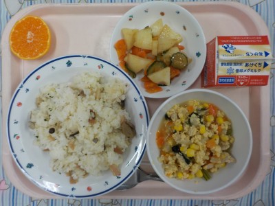 きのこピラフ、和風ポテトサラダ、イタリアンスープ、みかん、牛乳