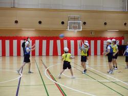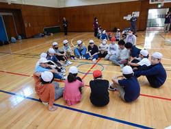 2年生は体を動かすことが好きな児童が多く、いつも楽しそうに活動に取り組んでいます。体育館ではボールの代わりに袋を投げ合い、床に落とさないように競い合う「ボンバーゲーム」、校庭ではボールを的に当てて点数を競い合う「的当てゲーム」を行っています。試合の後にはチームごとやクラス全体で振り返りを行うことで、次時の学習への意欲も高まっています。
