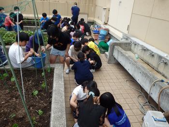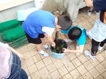 5年生は総合の時間と社会の授業で「お米」について学習します。今日はパルシステムの方に来ていただき、日本の自給率やお米ができるまでの話を聞きました。昔に比べてお米を食べる人が半分になったことに驚いていました。後半は実際にバケツに苗を植えました。泥だらけになりながら一生懸命植えていました。農家さんの大変さを感じることができました。