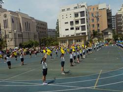 1年生の体育学習発表会の練習風景です。毎日、一生懸命練習しています。旗をもつと迫力が増します。ぜひ楽しみにしていてください。