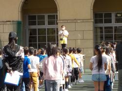 全校児童が校庭に集まり、開会式を行いました。1年生の代表児童が、今日がんばりたいことを立派に発表してくれました。