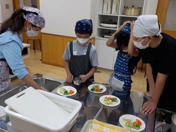 ゆでたりする経験を経て、今回はまとめとして、「カラフルゆで野菜サラダ」を作りました。限られた時間の中で、グループで