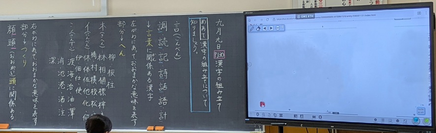 全学級に大型電子黒板を導入しました。今までは、黒板中央にスライド等を投影していましたが、黒板と併用して使用できるようになりました。