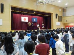 着任式・始業式では、新年度を迎え、着任式では校長先生から新しく赴任した先生の紹介などがありました。始業式では、代表の6年生児童が今年度の抱負を堂々と話しました。入学式では、今年度は、体育館で入学式を行うことができました。校長先生からの「あいさつする・考える・失敗を大切のする」という「あ・か・し」のお話を子ども達は一生懸命に聞いていました。